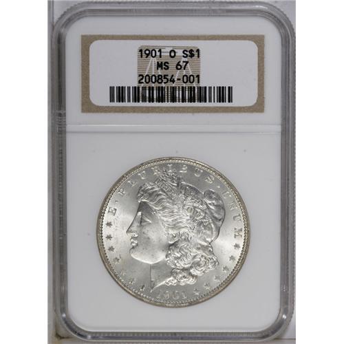 <B>1901-O<img border='0' src='http://www.heritagecoins.com/images/star.gif' width=10 height=10>$1> MS67 NGC.</B></I> The release of multiple bags of the 1901-O in 1962 sealed the fate of this issue as a common date. However, just a handful of Superb coins are known. Such coins are eagerly sought by Morgan collectors and are among the most attractive in the series. The finish is noticeably different on a high grade 1901-O than an 1881-S, for instance. The 1901-O has bright, satin-like mint luster, whereas the 1881-S is invariably frosted. This piece has a thick, satiny finish and is nearly void of any blemishes--certainly none are visible with the unaided eye. Brilliant throughout. Census: 10 in 67, 0 finer (8/06).