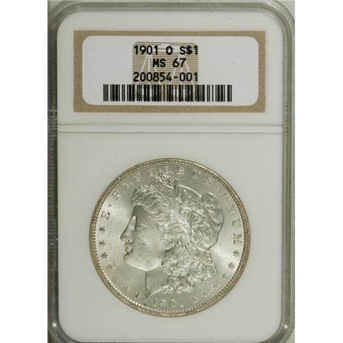 <B>1901-O S$1 MS67 NGC.</B></I> The release of multiple bags of the 1901-O in 1962 sealed the fate of this issue as a common date. However, just a handful of Superb coins are known. Such coins are eagerly sought by Morgan collectors and are among the most attractive in the series. The finish is noticeably different on a high grade 1901-O than an 1881-S, for instance. The 1901-O has bright, satin-like mint luster, whereas the 1881-S is invariably frosted. This piece has a thick, satiny finish and is nearly void of any blemishes--certainly none are visible with the unaided eye. Brilliant throughout. Census: 11 in 67, 0 finer (1/07).<BR><BR><b>Shipping:</b> Coins & Currency (<a target="_blank" href="http://www.heritageauctions.com/common/shipping.php">view shipping information</a>)