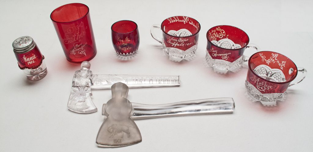 8 Assorted Glassware 1. Toothpick 2 1/4" Pan Am 1901 Buffalo "John" 2. Teacup 2 1/2" Pan Am Expo Buffalo 1901 Flower 3. Teacup 2 1/2" Pan American 1901 "Cecil" 4. Teacup 2 1/2" Pan American 1901 Buffalo "Mother" 5. Pepper 3" "Annie" 1901 some lite chips 6. Spooner 4" Pan American 1901 "Father" 7. Tomahawk 7" 1901 "Buffalo" Clear with Few lite chips on blade 8. Tomahawk 7" 1901 "Indian Chief" ClearCity: County: State: