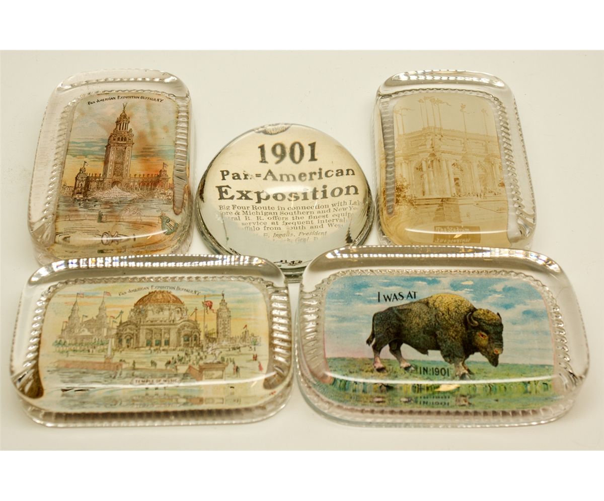 Collection of 5 Glass Paper Weights. 1) I was at "Buffalo" in 1901, Colorized Buffalo Horizontal. 2) 1901 Pan American Expo., Round. 3) Electric Tower, Horizontal. 4) The Stadium, Vertical etched F.G. Soula. 5) Temple of Music, Horizontal. -60059