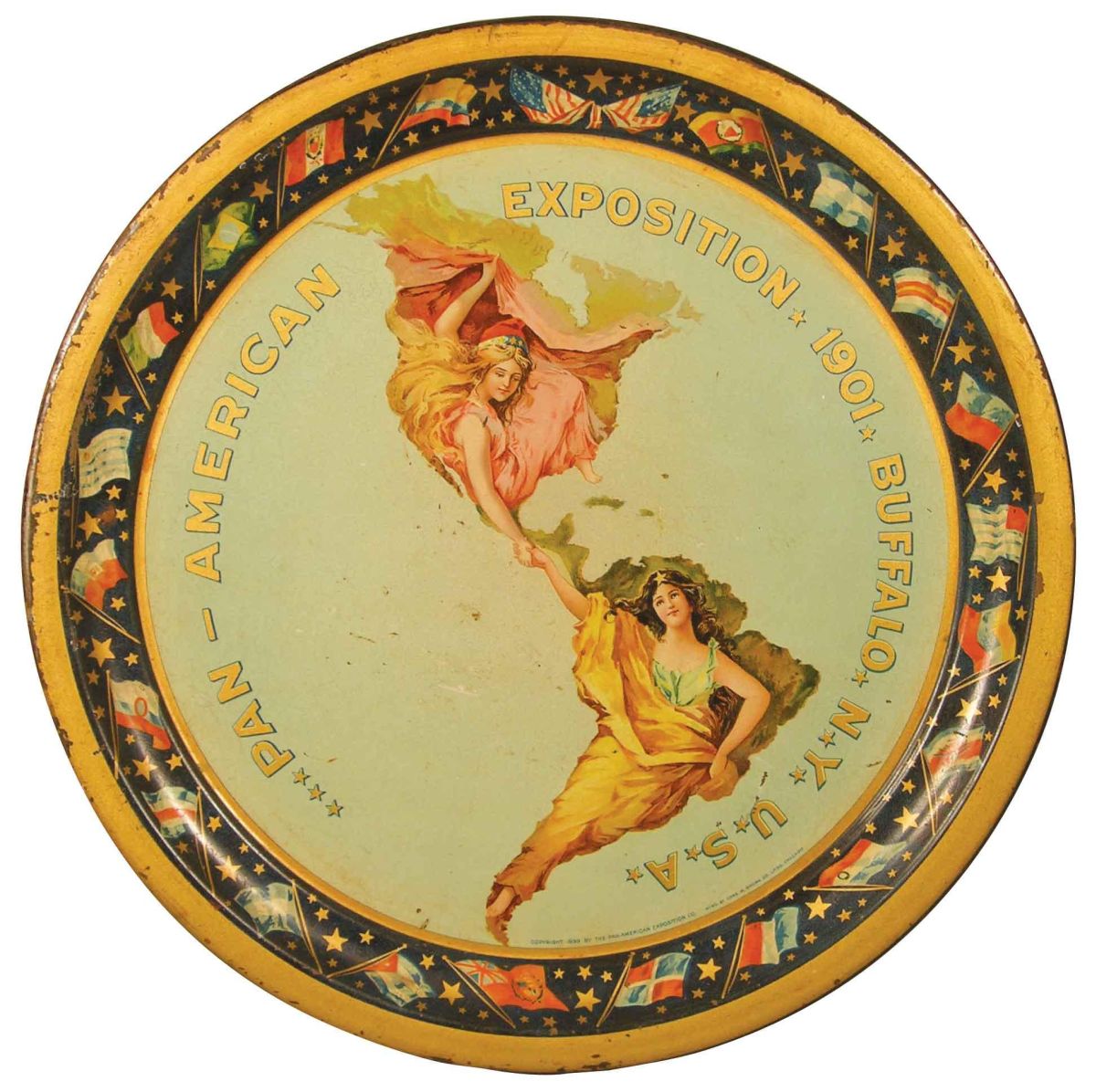 1901 Pan American Exposition Tin Serving Tray, Buffalo, NY. Some minor scratches and edge ware otherwise good condition. 12 inch diameter. Start Price $60