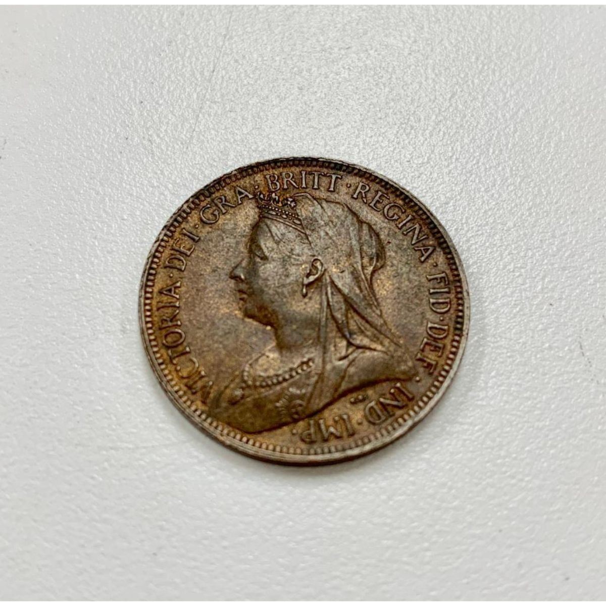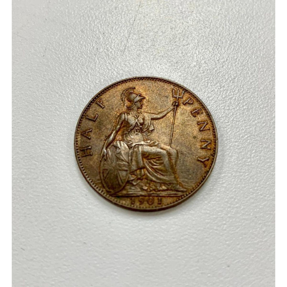 Obverse Old crowned and veiled portrait ('Old Head') of Queen Victoria facing left, legend around. Lettering: VICTORIA·DEI·GRA·BRITT·REGINA·FID· DEF·IND·IMP· T.B. Translation: Victoria by the Grace of God Queen of the Britains Defender of the Faith Empress of India Engraver: Thomas Brock Reverse Seated figure of Britannia right, trident in left hand, shield bearing the Union flag in right, denomination around, date in exergue, sea behind Lettering: HALF PENNY 1901 Engraver: Leonard Charles Wyon Edge Plain Specifications Country: United Kingdom Queen: Victoria (1837-1901) Type: Standard circulation coin Years: 1895-1901 Value: 1/2 Penny = 1/24 Shilling (1/480) Currency: Pound sterling (1158-1970) Composition: Bronze Weight: 5.67 g Diameter: 25.5 mm Thickness: 1.3 mm Shape: Round Â