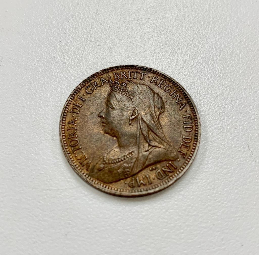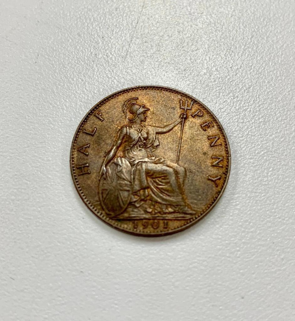 Obverse Old crowned and veiled portrait ('Old Head') of Queen Victoria facing left, legend around. Lettering: VICTORIA·DEI·GRA·BRITT·REGINA·FID· DEF·IND·IMP· T.B. Translation: Victoria by the Grace of God Queen of the Britains Defender of the Faith Empress of India Engraver: Thomas Brock Reverse Seated figure of Britannia right, trident in left hand, shield bearing the Union flag in right, denomination around, date in exergue, sea behind Lettering: HALF PENNY 1901 Engraver: Leonard Charles Wyon Edge Plain Specifications Country: United Kingdom Queen: Victoria (1837-1901) Type: Standard circulation coin Years: 1895-1901 Value: 1/2 Penny = 1/24 Shilling (1/480) Currency: Pound sterling (1158-1970) Composition: Bronze Weight: 5.67 g Diameter: 25.5 mm Thickness: 1.3 mm Shape: Round