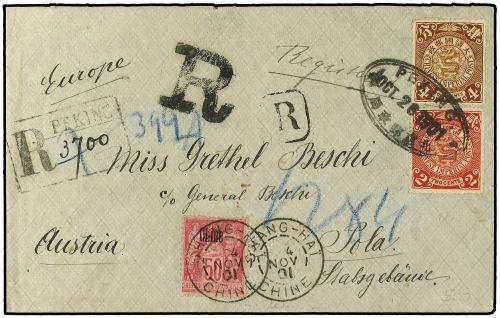 1901 Registered combination cover to Pola/Austria franked on front and back by China CIP ½ c. brown (4), 1 c. orange (4), 2 c. red (5) and single 4 c. all tied by bilingual Peking oval datestamp in black. Mailed via Shanghai French PO with Chine 50 c. carmine tied by cds (Nov 4). Delightful and scarce, should be opened for better display.