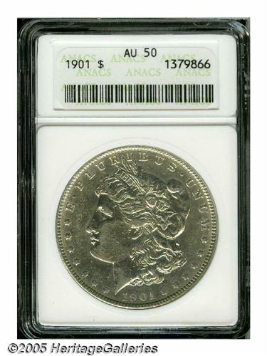 <B>1901<S$1> AU50 ANACS.</B></I> Bright surfaces are virtually untoned, and exhibit a few minor contact marks scattered about. The design elements are well defined, except for the hair over Liberty's ear and the eagle's breast.