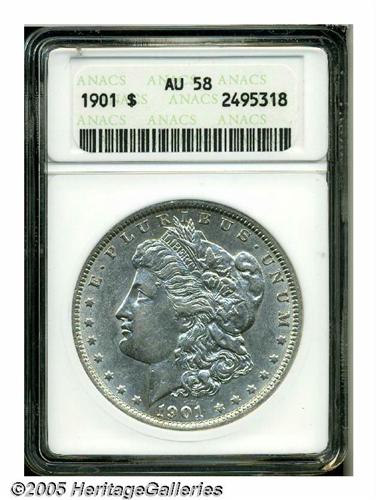 <B>1901<S$1> AU58 ANACS.</B></I> A briefly circulated but lightly toned and completely problem-free example of this famous conditional rarity. The high mintage 1901 is common in VF and XF grades, but is scarce (and eagerly pursued) in Mint State.