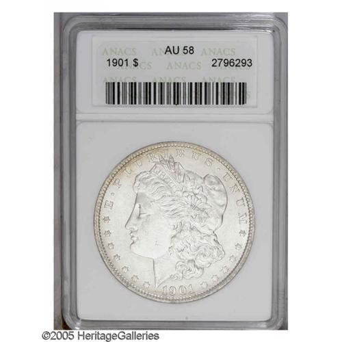 1901 S$1 AU58 ANACS. A mere hint of friction on the ha 1901[S$1] AU58 ANACS.