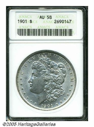 <B>1901<S$1> AU58 ANACS.</B></I> Brilliant with almost all of the original mint luster still surviving. A few tiny marks are noted on Liberty's cheek and chin, consistent with the grade. Scarcer in all grades than one would guess from the 6,962,813 mintage figure; evidently, a large portion of these ended up being melted pursuant to the provisions of the Pittman Act of 1918.