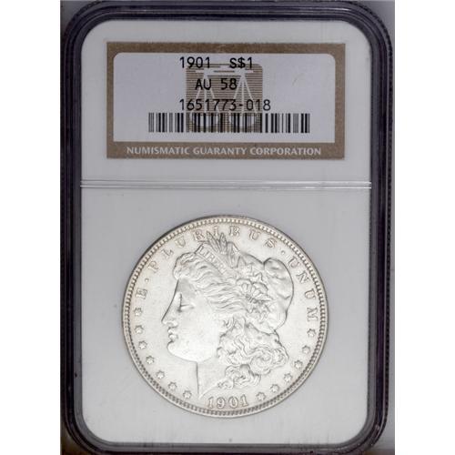<B>1901<img border='0' src='http://www.heritagecoins.com/images/star.gif' width=10 height=10>$1 AU58 NGC.</B></I> Bright surfaces display traces of light tan around the peripheries, and are lightly abraded. The design elements are well defined, except for the hair above Liberty's ear.