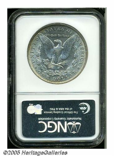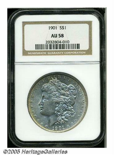 <B>1901<S$1> AU58 NGC.</B></I> Luster extends into the open fields of this briefly circulated (and conditionally scarce) Morgan Dollar. Luminous gold color fills the margins. A pinscratch beneath the wreath bow is noted.