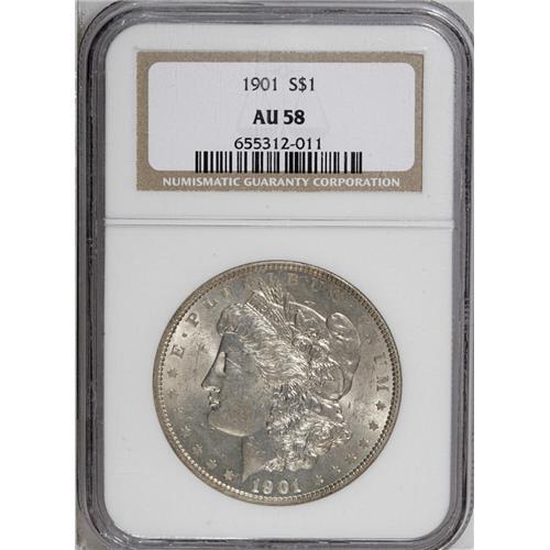 <B>1901<img border='0' src='http://www.heritagecoins.com/images/star.gif' width=10 height=10>$1> AU58 NGC.</B></I> Pleasing copper-tan color adorns the obverse of this boldly struck, lustrous example. Mildly worn on the highpoints, with several heavy pinscratches in the left obverse field area. Very near to Mint State.
