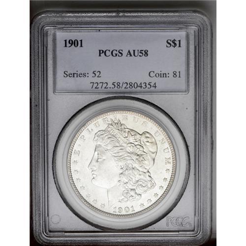 <B>1901<img border='0' src='http://www.heritagecoins.com/images/star.gif' width=10 height=10>$1 AU58 PCGS.</B></I> A sharply struck example of this conditionally challenging issue. The surfaces are essentially untoned, save for a whisper of apricot-gold color on the right side of the reverse. The luster is close to full, and the central devices have a trivial degree of friction.