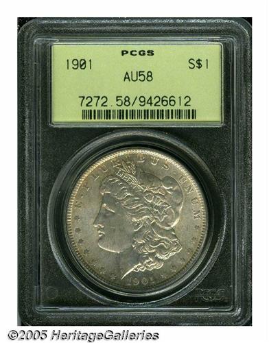 <B>1901<S$1> AU58 PCGS.</B></I> An example of this well known condition rarity that just misses Mint State status. Light golden-gray toning is accented by shimmering luster. Just the slightest hairlines and small contact marks limit the grade.<BR><I>From The Dr. John L. Pellegrini Collection.</B></I>