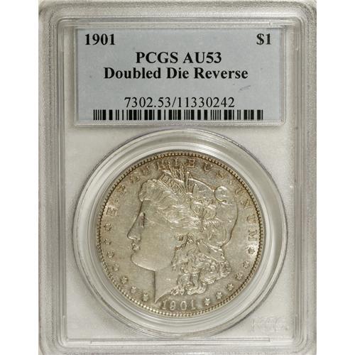 <B>1901 S$1 Doubled Die Reverse AU53 PCGS.</B></I> VAM-3. A Top 100 Variety. Finding an attractive AU representative of this popular VAM variety further confounds an already complicated search, as any 1901 Morgan dollar is elusive the closer one comes to the Mint State grades. This coin is well struck with considerable luster beneath thin aqua-gray and green-gold patina. Light wear appears at the highpoints, though this has little impact on the tailfeathers, which show this variety's famous and bold doubling. Population: 16 in 53, 28 finer (2/07).<BR><BR><b>Shipping:</b> Coins & Currency (<a target="_blank" href="http://www.heritageauctions.com/common/shipping.php">view shipping information</a>)