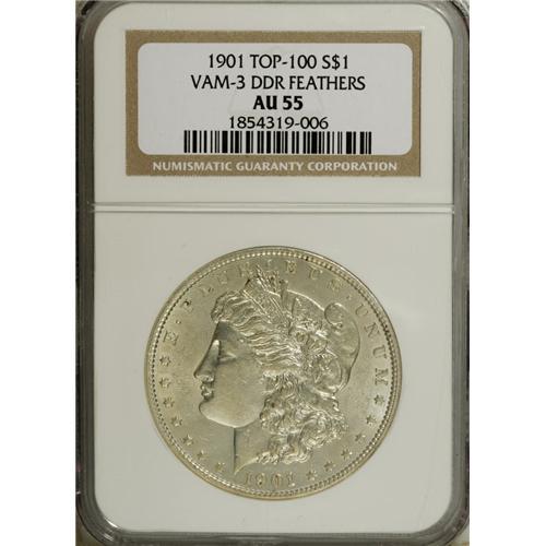<B>1901 S$1 Doubled Die Reverse AU55 NGC.</B></I> VAM-3. A Top 100 Variety. A rare coin in its own right as a Choice AU 1901-P silver dollar, and much, much rarer as a representative of the elusive "Shifted Eagle" VAM-3 variety. The eagle's tail feathers and the bottoms of the wing feathers are boldly doubled, the result of a misaligned hubbing. This lightly circulated silver-gold example has good luster and a typical strike for the issue--but as a high-grade "Shifted Eagle," this coin will be high on many collectors' want lists.<BR><BR><b>Shipping:</b> Coins & Currency (<a target="_blank" href="http://www.heritageauctions.com/common/shipping.php">view shipping information</a>)