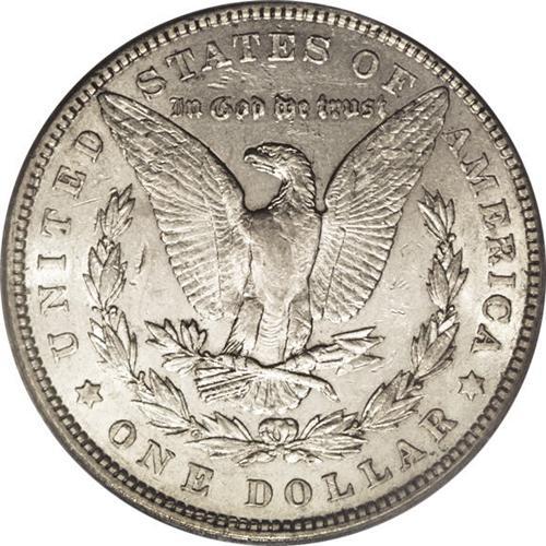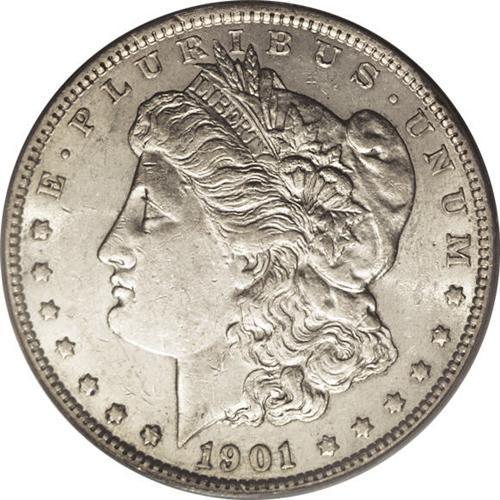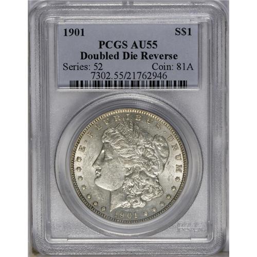 <B>1901<img border='0' src='http://www.heritagecoins.com/images/star.gif' width=10 height=10>$1> Doubled Die Reverse AU55 PCGS.</B></I> VAM-3. A Top 100 Variety. The central reverse is die doubled south with a wide spread. The doubling is especially pronounced on the arrows and tail feathers. While any Choice AU 1901 dollar is desirable due to its conditional rarity, this popular <I>Guide Book</B></I> variety nonetheless carries a strong premium. Freckles of honey-gold color outline the devices. A band of bright luster connects the stars and legends.<BR><I>From The Chicago-Ark Collection.</B></I>