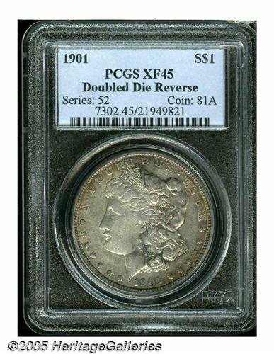 <B>1901<S$1> Doubled Die Reverse XF45 PCGS.</B></I> VAM-3. A Top 100 Variety. The reverse is strongly die doubled south, most noticeable on the tail feathers. The 1901 is a noted conditional rarity in any event, but the dramatic Doubled Die Reverse is rare in all grades. Dusky orange-gold and battleship-gray colors enrich this moderately circulated but attractive piece. A small obverse dig is noted at 8 o'clock.