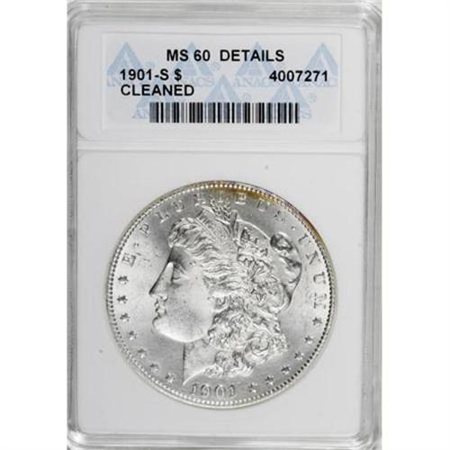 <B>1901-S $1 --Cleaned--ANACS. MS60 Details.</B></I> NGC Census: (17/1216). PCGS Population (22/2206). Mintage: 2,284,000. Numismedia Wsl. Price for NGC/PCGS coin in MS60: $325. (#7276)<BR><BR><B>Coin Engraver:</B> George T. Morgan<BR><BR><b>Shipping:</b> Coins & Currency (<a target="_blank" href="http://www.heritageauctions.com/common/shipping.php">view shipping information</a>)