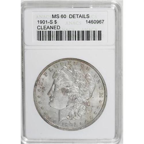 <B>1901-S $1 --Cleaned--ANACS MS60 Details.</B></I> NGC Census: (19/1243). PCGS Population (22/2255). Mintage: 2,284,000. Numismedia Wsl. Price for NGC/PCGS coin in MS60: $325. (#7276)<BR><BR><B>Coin Engraver:</B> George T. Morgan<BR><BR><b>Shipping:</b> Coins & Currency (<a target="_blank" href="http://www.heritageauctions.com/common/shipping.php">view shipping information</a>)