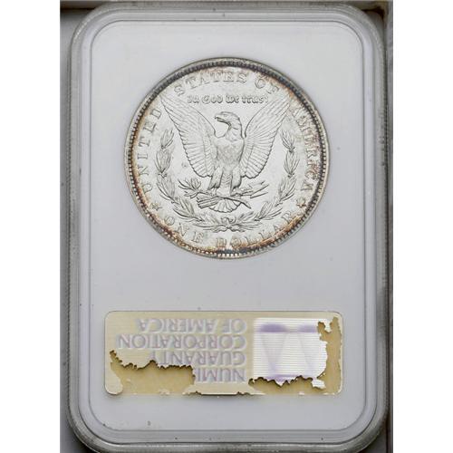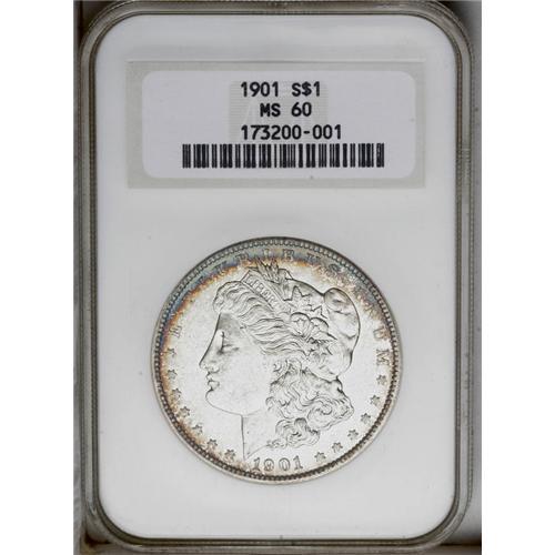<B>1901<img border='0' src='http://www.heritagecoins.com/images/star.gif' width=10 height=10>$1> MS60 NGC.</B></I> Typically struck and showing indications of minor die erosion, with a noticeable orange-peel texture to the reverse fields and peripheral regions. Rich full luster produces showy cartwheel effects on each side, and deep cobalt-blue and golden-brown peripheral accents improve the eye appeal of the piece. Moderate scuffiness on Liberty's face precludes a higher grade.