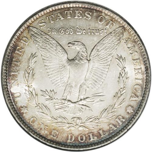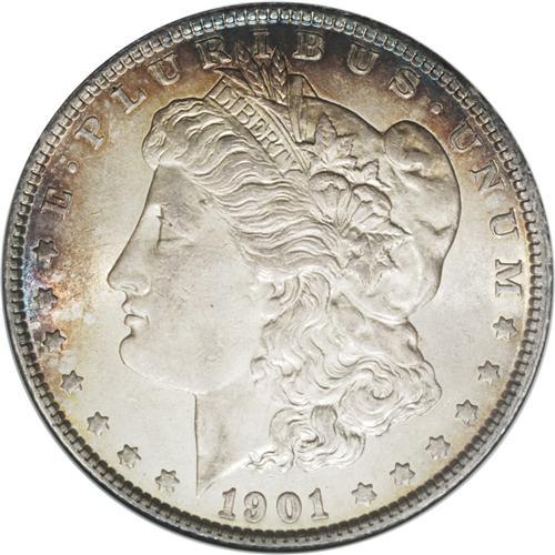 <B>1901<img border='0' src='http://www.heritagecoins.com/images/star.gif' width=10 height=10>$1> MS61 ANACS.</B></I> Fully lustrous with some central weakness on each side. The surfaces are mostly brilliant or pale-gray with lovely gold, lilac, and blue toning along the border, especially on the obverse.