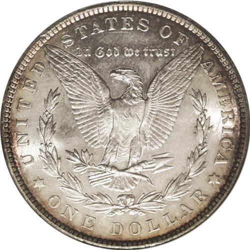 <B>1901<img border='0' src='http://www.heritagecoins.com/images/star.gif' width=10 height=10>$1> MS61 NGC.</B></I> A peripherally toned, strictly Mint State example of this scarcer P-mint date. A mixture of sunset-red and sea-green accents the rims on each side. Scattered abrasions are present and define the grade, but the arm's-length eye appeal is still decent overall.