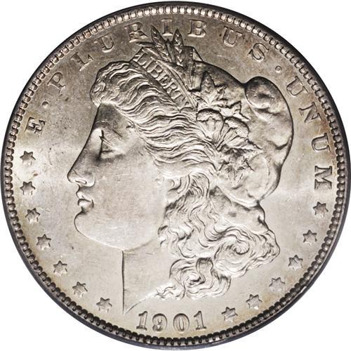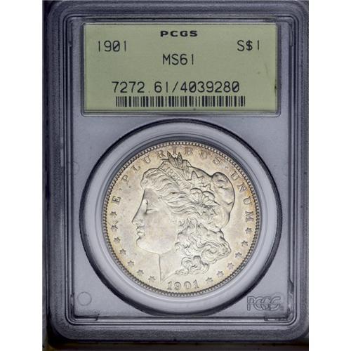 <B>1901<img border='0' src='http://www.heritagecoins.com/images/star.gif' width=10 height=10>$1> MS61 PCGS.</B></I> Another of the several magical dates in the Morgan dollar series, one that commands instant respect in Mint State grades, as here. This example is lightly patinated in amber-gold on both sides. There are a few minor abrasions on the obverse, none of them singularly mentionable nor overly distracting. The strike is robust, save for the flat eagle's feathers, due to the use of the new C4 reverse. Excellent eye appeal for the grade, and certified in a green label holder. <BR><BR><B>Important notice:</B> Heritage usually auctions material at the rate of 200-250 lots per hour. On some occasions eBay Live bid software or the Internet may not be able to keep up with the pace of the auction. We recommend placing a realistic absentee bid now as insurance to avoid disappointment. Occasionally the auctioneer may eliminate or reject an eBay Live bid, and the auctioneer may also reopen a lot after the close of the eBay live bidding (usually because we missed an audience bid), and may reject your bid even if it shows you as the winning bidder. By bidding via eBay Live, you agree that Heritage may award the lot to another bidder at its sole discretion under the circumstances described above or any other reasonable circumstances. Since eBay bids are not shown to us until we open the lot on the floor, we treat those bids just like floor bids. In most cases the floor responds before the eBay bid is presented to us, due to Internet lag time, so for consistency we have made it a policy that floor bids are always considered first over tie eBay live bids. Also please note that all Heritage lots purchased through eBay Live carry a 20% Buyer's Premium. Please make sure you read the Terms and Conditions before you bid. This lot is being auctioned in conjunction with a live floor auction by Heritage Galleries & Auctioneers. All final auction and invoice information will be supplied by Heritage Galleries & Auctioneers, and all other information should be considered preliminary. Lot:3758 <BR><BR><B>Winning Notification and Billing:</B> After the FINAL session in this auction is complete, Heritage will send e-mail and snail mail invoices. This process normally takes several days. All final auction and invoice information will be supplied by Heritage Galleries & Auctioneers, and all other information should be considered preliminary. <BR><BR>This auction will be conducted on a live auction floor and over the Internet through eBay Live. If you choose to place an absentee bid, please take a moment to <font color='#0000ff'><u><a href='http://pages.ebay.com/liveauctions/help/before/laabsentee.html'>learn how eBay Live absentee bidding works</a></u></font><font color='#000000'>