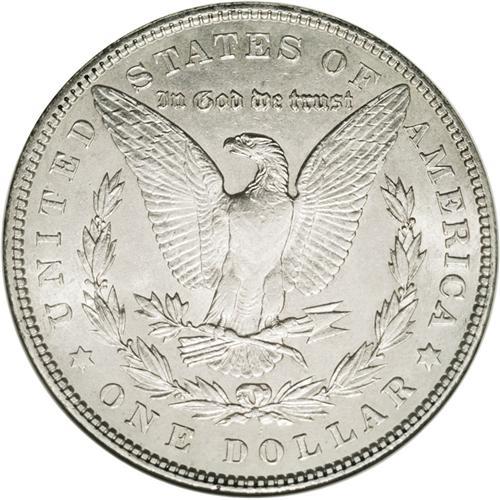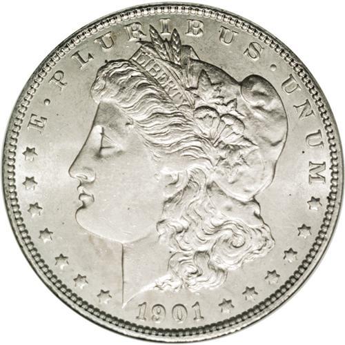 <B>1901<img border='0' src='http://www.heritagecoins.com/images/star.gif' width=10 height=10>$1> MS62 ANACS.</B></I> Satiny silver surfaces with hazy gray toning on both sides. Fully lustrous with sharp design details other than the hair over Liberty's ear or the eagle's breast feathers. These areas nearly always show characteristic weakness.