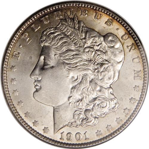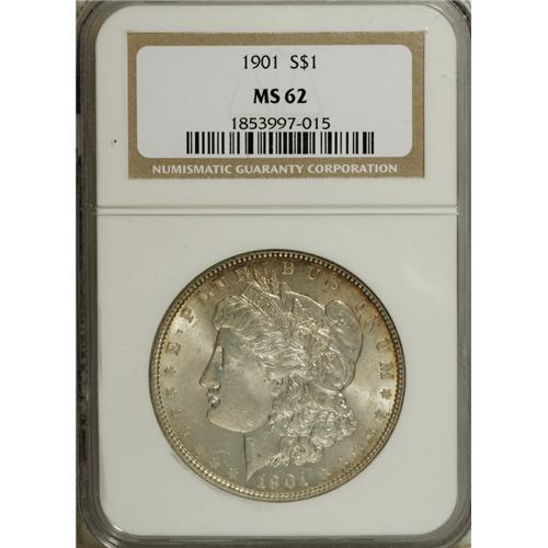 <B>1901 S$1 MS62 NGC.</B></I> The conditional scarcity of the 1901 dollar is known to others than just collectors of Morgan dollars. The substantial mintage and its lack of availability in Uncirculated grades suggest widespread melting. This is a satiny example that is mostly untoned except for a slight accent of golden around the margins. A bit weakly struck in the centers.<BR><BR><b>Shipping:</b> Coins & Currency (<a target="_blank" href="http://www.heritageauctions.com/common/shipping.php">view shipping information</a>)