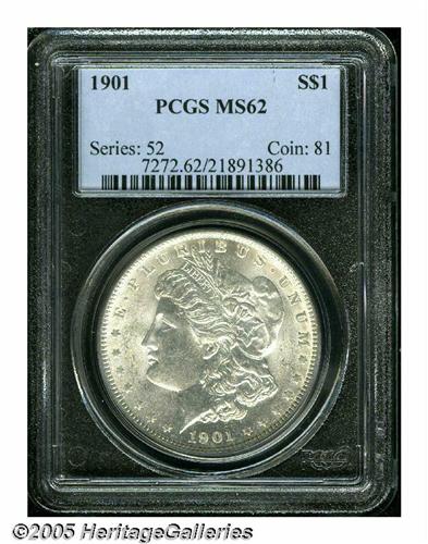 <B>1901<S$1> MS62 PCGS.</B></I> A flashy Mint State example of this conditionally scarce, semi-key date Morgan dollar. This piece has bright satiny luster that is really quite attractive, and much better than that usually seen on this issue. There are a few small abrasions on each side that account for the grade.