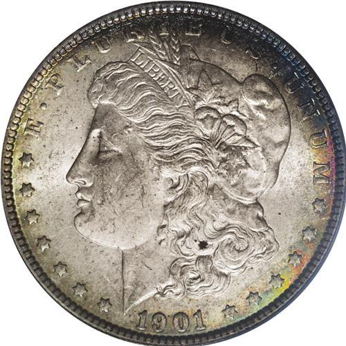 <B>1901 S$1 MS62 PCGS.</B></I> Ex: Ray George. A lustrous and well struck example from the earliest year of the 20th century. The surfaces have silver-gray, orange, green, and red-violet patina on each side, as well as an isolated spot of deep toning on the obverse and several similar areas on the reverse. Light abrasions on the devices account for the grade.<BR><I>From The Cocoa Beach Collection.</B></I><BR><BR><b>Shipping:</b> Coin/Currency (<a target="_blank" href="http://www.heritageauctions.com/common/shipping.php">view shipping information</a>)