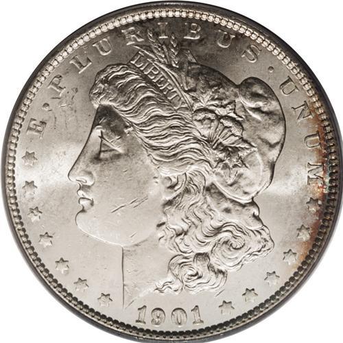 <B>1901 S$1 MS62 PCGS.</B></I> Numismatists categorize this issue as the hardest P-mint Morgan dollar to obtain in Mint State. The present example is mostly brilliant, with some russet toning hugging the edges of both sides. It is held back from a higher grade by several moderate abrasions on Liberty's cheek and neck, but the surfaces elsewhere are essentially problem-free and highly lustrous. This issue makes quantum price leaps from one Mint State grade to the next. A highly appealing coin. Population: 183 in 62, 115 finer (12/06).<BR><BR><b>Shipping:</b> Coin/Currency (<a target="_blank" href="http://www.heritageauctions.com/common/shipping.php">view shipping information</a>)