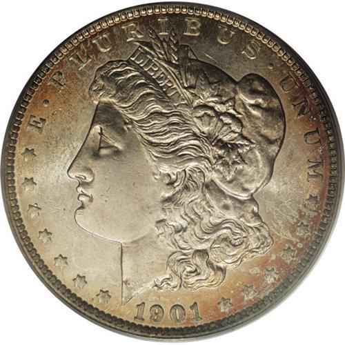 <B>1901 S$1 MS62 PCGS.</B></I> The 1901 dollar is relatively plentiful in circulated grades, but is scarce to rare in Mint State. This MS62 coin exhibits lustrous surfaces that are visited by whispers of crimson and orange-gold, especially on the obverse periphery. Generally well struck. Small contact marks on the central devices define the grade.<BR><BR><b>Shipping:</b> Coins & Currency (<a target="_blank" href="http://www.heritageauctions.com/common/shipping.php">view shipping information</a>)