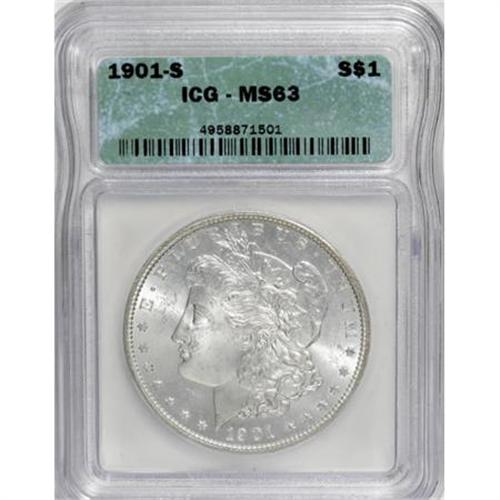 <B>1901-S $1 MS63 ICG.</B></I> . NGC Census: (393/569). PCGS Population (832/978). Mintage: 2,284,000. Numismedia Wsl. Price for NGC/PCGS coin in MS63: $580. (#7276)<BR><BR><B>Coin Engraver:</B> George T. Morgan<BR><BR><b>Shipping:</b> Coins & Currency (<a target="_blank" href="http://www.heritageauctions.com/common/shipping.php">view shipping information</a>)