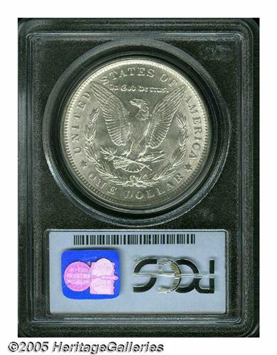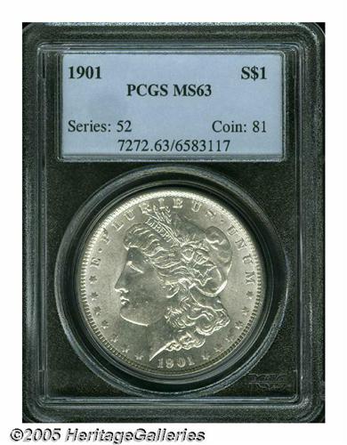 <B>1901<S$1> MS63 PCGS.</B></I> This conditionally rare issue is very seldom seen in any Mint State grade at all, and is virtually impossible to locate any finer than the presently offered coin. While 6.9 million pieces were originally struck, the vast majority either entered circulation and stayed there or were melted under provisions of the Pittman Act of 1918. A fully brilliant, untoned appearance is seen over the surfaces, and the luster is above average for this often dull and lackluster issue. Only a few light, scattered abrasions are present, giving this piece nice eye appeal for the grade. Population: 76 in 63, 21 finer (3/05).<BR><I>From The Milwaukee Shore Collection.</B></I>