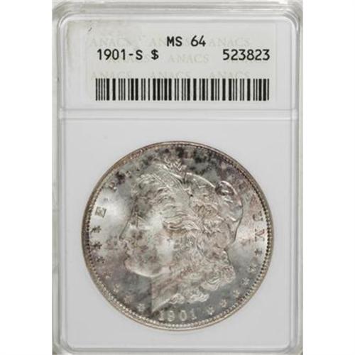 <B>1901-S $1 MS64 ANACS.</B></I> Splashes of lilac and cerulean toning are visible on both sides of this sharply detailed and highly lustrous example. Scattered marks are hidden and not immediately obvious.<BR><BR><B>Coin Engraver:</B> George T. Morgan<BR><BR><b>Shipping:</b> Coins & Currency (<a target="_blank" href="http://www.heritageauctions.com/common/shipping.php">view shipping information</a>)