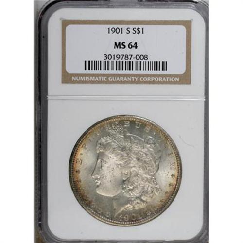 <B>1901-S $1 MS64 NGC.</B></I> This is an amazing near-Gem representative of this elusive date with only 89 finer pieces certified by NGC. Both sides have full cartwheel luster with considerable silver-white color, ringed by peripheral gold and iridescent toning, especially on the obverse. <BR><BR><B>Coin Engraver:</B> George T. Morgan<BR><BR><b>Shipping:</b> Coins & Currency (<a target="_blank" href="http://www.heritageauctions.com/common/shipping.php">view shipping information</a>)