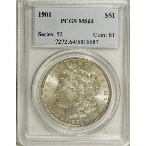 <B>1901 S$1 MS64 PCGS.</B></I> Only a trace of pale champagne toning is present on each side of this satiny near-Gem. It is a sharply struck piece with excellent detail on both sides. The typical 1901 has unusual texturing on the reverse, caused by abnormal metal flow that resulted from improper striking pressure. Seen on some other dates, the resulting rippled surfaces are more pronounced on this date than any other in the series. Collectors are advised to seek an example such as this piece, where the unusual textured appearance is minimal.<BR> For the serious collector of Morgan dollars, this date is one of the biggest challenges in the series, and is usually found in circulated or low-end Mint State grades. Choice and Gem pieces are extremely rare. Like certain other dates, nearly all of the production of 1901 Morgan dollars was placed in circulation. Even AU coins are common, although a shortage of true Mint State pieces keeps the price of AU coins at strong levels. For the connoisseur, Choice and Gem pieces appear on the market infrequently, but are well worth the wait.<BR> 1901 was a transitional year at the Philadelphia Mint. The new Spring Garden Street facility was occupied in June, and ready to begin coinage production in October. It seems that nearly the entire Morgan dollar production was accomplished at the old facility on Chestnut Street. Official Mint records indicate that 6,842,000 coins were produced from January through September, and only 120,000 during the remaining three months at the new Mint building. Population: 20 in 64, 3 finer (2/07).<BR><I>From The Jackson Hole Collection.</B></I><BR><BR><b>Shipping:</b> Coins & Currency (<a target="_blank" href="http://www.heritageauctions.com/common/shipping.php">view shipping information</a>)