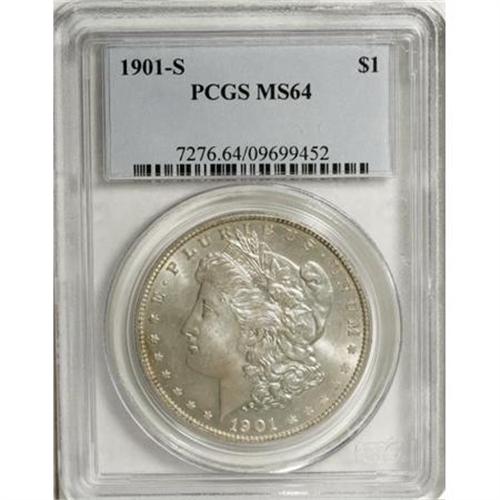 <B>1901-S $1 MS64 PCGS.</B></I> One of the more challenging 20th century S-mint Morgans in Choice, the 1901-S is represented here by a predominantly silver-gray example that exhibits blushes of gold and rose. Well struck with excellent eye appeal.<BR><BR><B>Coin Engraver:</B> George T. Morgan<BR><BR><b>Shipping:</b> Coins & Currency (<a target="_blank" href="http://www.heritageauctions.com/common/shipping.php">view shipping information</a>)