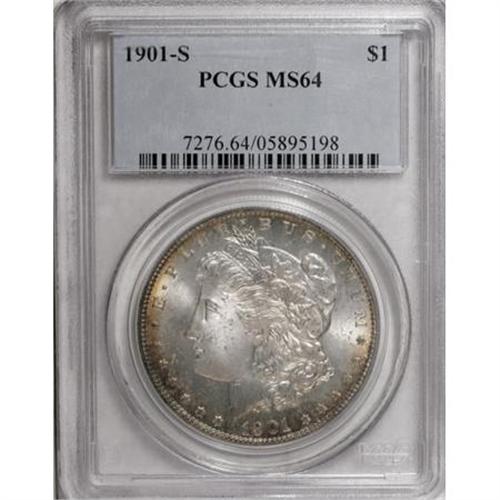 <B>1901-S $1 MS64 PCGS.</B></I> Whispers of peripheral golden-tan, electric-blue, and purple are more prominent on the obverse of this near-Gem. Pleasing luster throughout, and generally well struck. A few minute marks limit the grade. Light roller marks are visible on the central obverse.<BR><BR><B>Coin Engraver:</B> George T. Morgan<BR><BR><b>Shipping:</b> Coins & Currency (<a target="_blank" href="http://www.heritageauctions.com/common/shipping.php">view shipping information</a>)