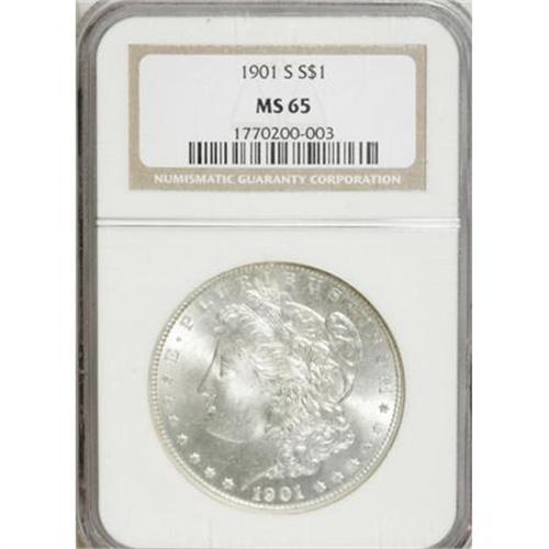 <B>1901-S $1 MS65 NGC.</B></I> This example has brilliant surfaces with just a touch of light golden toning. The design elements are sharp, although the hair strands over Liberty's ear are a little weak. Extremely clean fields and devices. An elusive issue in Gem quality and seldom encountered finer than this. Census: 85 in 65, 4 finer (11/07).<BR><I>From The Motor City Collection.</B></I><BR><BR><B>Coin Engraver:</B> George T. Morgan<BR><BR><b>Shipping:</b> Coins & Currency (<a target="_blank" href="http://www.heritageauctions.com/common/shipping.php">view shipping information</a>)