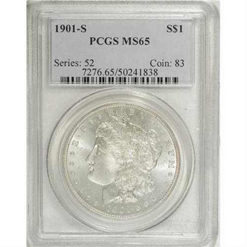 <B>1901-S $1 MS65 PCGS.</B></I> Pastel ice-blue and mauve color rests over highly lustrous surfaces, joined on the reverse by occasional speckles of olive-green. A sharp strike brings up good definition on the design elements, including the eagle's breast. A few minor marks are scattered about each side, none of which are worthy of individual mention.<BR><I>From the Reuben Reinstein Collection.</B></I><BR><BR><b>Shipping:</b> Coins & Currency (<a target="_blank" href="http://www.heritageauctions.com/common/shipping.php">view shipping information</a>)