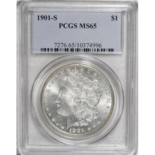 <B>1901-S $1 MS65 PCGS.</B></I> Both sides exhibit bright, satiny luster and are untoned except for a bit of milky coloration in the fields. Moderate roller marks are noted across the reverse. Liberty's cheek is clean, and the central striking details are typical for an '01-S, a scarce issue in the better grades of Mint State.<BR><BR><B>Coin Engraver:</B> George T. Morgan<BR><BR><b>Shipping:</b> Coins & Currency (<a target="_blank" href="http://www.heritageauctions.com/common/shipping.php">view shipping information</a>\)