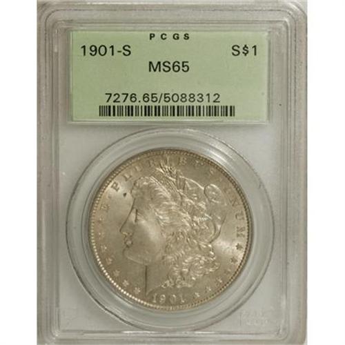 <B>1901-S $1 MS65 PCGS.</B></I> The 1901-S is fairly scarce within the context of Morgan dollars from this mint at the turn of the century. This MS65 example reveals a dusting of golden-gray patina resting on highly lustrous surfaces. The strike, while short of full, is clearly superior to the vast majority of '01-S Dollars, and the few minute contact marks are consistent with the grade designation. We note a small spot between the P in PLURIBUS and Liberty's brow. Still, a solid Gem example of this desirable late date S-mint. Housed in a green-label holder.<BR><I>From The Arnold & Harriet Collection, Part Two.</B></I><BR><BR><B>Coin Engraver:</B> George T. Morgan<BR><BR><b>Shipping:</b> Coins & Currency (<a target="_blank" href="http://www.heritageauctions.com/common/shipping.php">view shipping information</a>)
