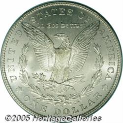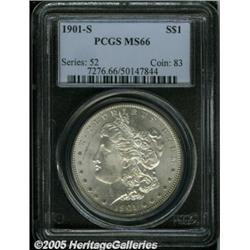 <B>1901-S<img border='0' src='http://www.heritagecoins.com/images/star.gif' width=10 height=10>$1 MS66 PCGS.</B></I> The 1901-S is a conditionally challenging issue, the first of four difficult S-mint Dollars that run through 1904. However, unlike the 1903-S and 1904-S, the '01-S is affordable and readily obtainable in lower Mint State grades. Apparently, enough of these coins were released from Federal vaults in the early 20th century to satisfy less selective collectors. However, sparkling better-than-Gem examples such as this piece are very elusive. Bright and highly lustrous, the striking details are well defined throughout, and there are no mentionable abrasions on either side. An exceptional coin. Population: 22 in 66, 1 finer (2/05).