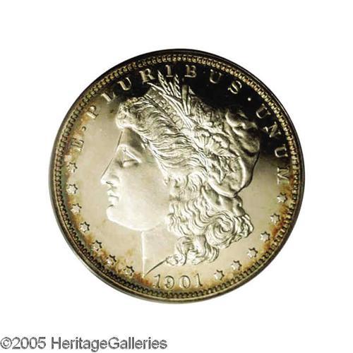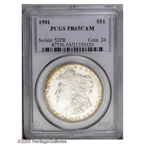 <B>1901<S$1> PR65 Cameo PCGS.</B></I> Brilliant through the centers with golden-russet peripheral accents. This glittering Gem possesses exceptional flash, with more field-to-device contrast than is generally seen on early 20th century proof issues. As a date, the 1901 is of great interest to collectors of the Morgan Dollar series, second only to the proof-only 1895, because of the profound lack of high quality Mint State 1901-P dollars. Population: 4 in 65, 5 finer (11/05).<BR><I>From The JFS Collection, Part Three.</B></I>
