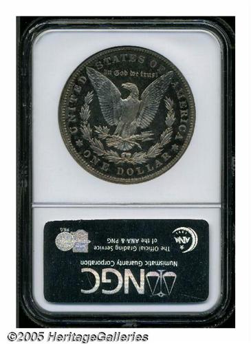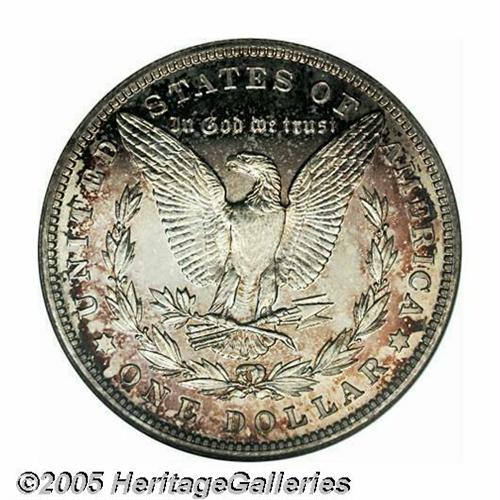 <B>1901<S$1> PR65 NGC.</B></I> For many years, the 1901 proof Morgan has been a popular alternative for collectors of Morgan Dollars because of the absolute scarcity and expense of high grade business strikes. As a result, high grade proofs consistently bring a premium when they are offered at public auction. This is an exceptionally nice piece, and an unusual one at that. Unlike most proofs struck from 1901 through 1905 or so, this piece actually shows slight contrast between the fields and devices as the coin is turned under a light. Richly toned throughout, mottled violet-russet toning deepens somewhat toward the peripheries. Close examination reveals a thin, lateral scratch across Liberty's cheek. Population: 32 in 65, 36 finer (4/05).