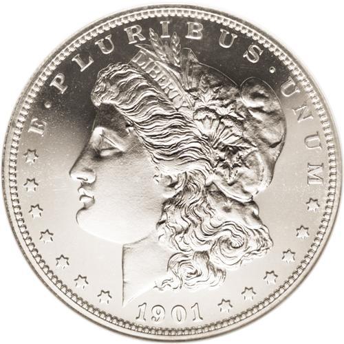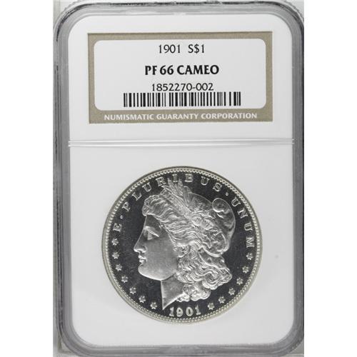 <B>1901<img border='0' src='http://www.heritagecoins.com/images/star.gif' width=10 height=10>$1> PR66 Cameo NGC.</B></I> The brilliant obverse on its own likely merits an Ultra Cameo designation, since the portrait is deeply and fully frosted. The reverse also displays obvious cameo contrast, but displays faint tan patina. DOLLAR is nicely die doubled, although this variety should not be confused with the dramatic <I>Guide Book</B></I> doubled die reverse. Close examination reveals pinpoint carbon flecks on the reverse. Census: 5 in 66 Cameo, 3 finer (9/06).