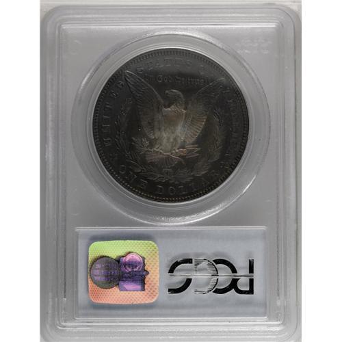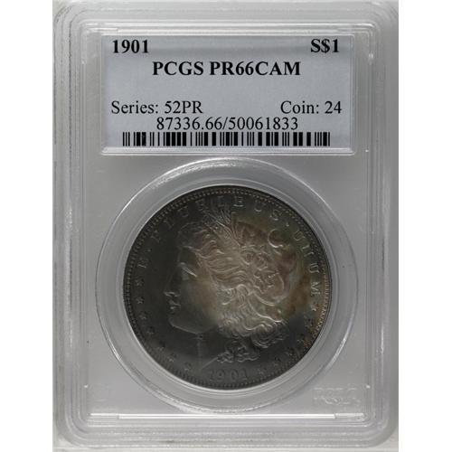 <B>1901<img border='0' src='http://www.heritagecoins.com/images/star.gif' width=10 height=10>$1> PR66 Cameo PCGS.</B></I> VAM-4. The 1901 is one of the more desirable proof Morgan dates, perhaps second only in importance to the 1895, due to the profound lack of high quality business strikes from this year. This is a wonderfully preserved specimen that actually displays slight contrast between the fields and devices, unusual for proofs from this time period. A large crescent of deep multicolored toning covers about two thirds of the obverse and similar colorations leave a small opening of near-brilliance over the eagle on the reverse. Intricately struck save for the hair directly above the ear. The reverse is die doubled, strongest on ONE DOLLAR, a diagnostic for the proof issue. Population: 6 in 66 Cameo, 0 finer (5/06).