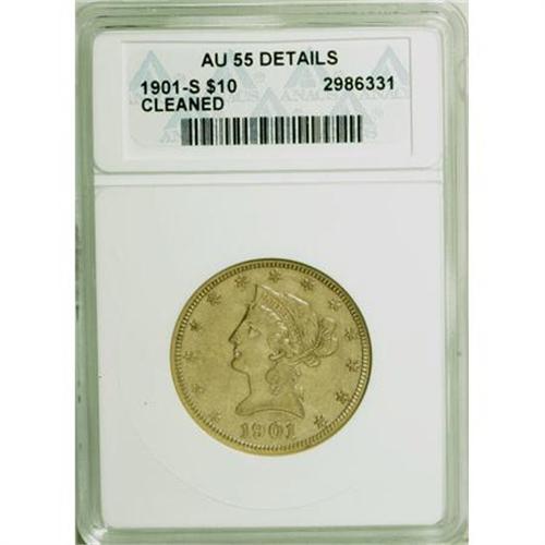 <B>1901-S $10 --Cleaned--ANACS. AU55 Details.</B></I> NGC Census: (19/12055). PCGS Population (19/12774). Mintage: 2,812,750. Numismedia Wsl. Price for NGC/PCGS coin in AU55: $354. (#8749)<BR><BR><b>Shipping:</b> Coins & Currency (<a target="_blank" href="http://www.heritageauctions.com/common/shipping.php">view shipping information</a>)